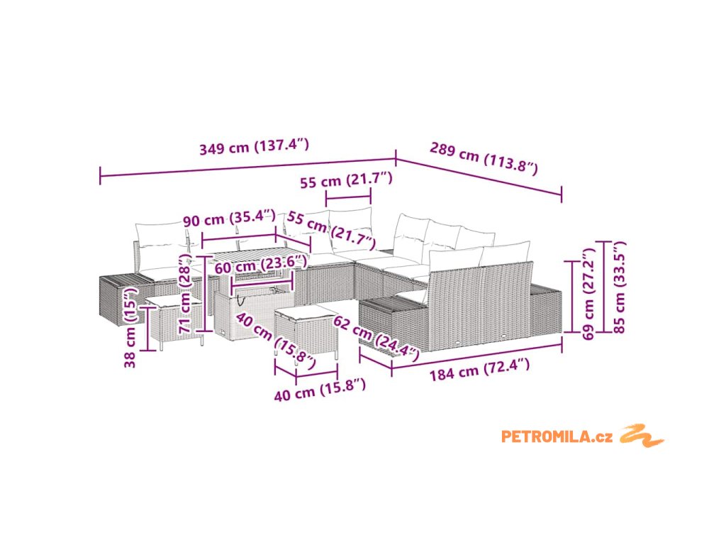 - 2 x Boční sofa, 2 x Rohové sedadlo, 6 x Centrální sedadlo, 2 x Dlouhý stolička, 1 x Stůl
