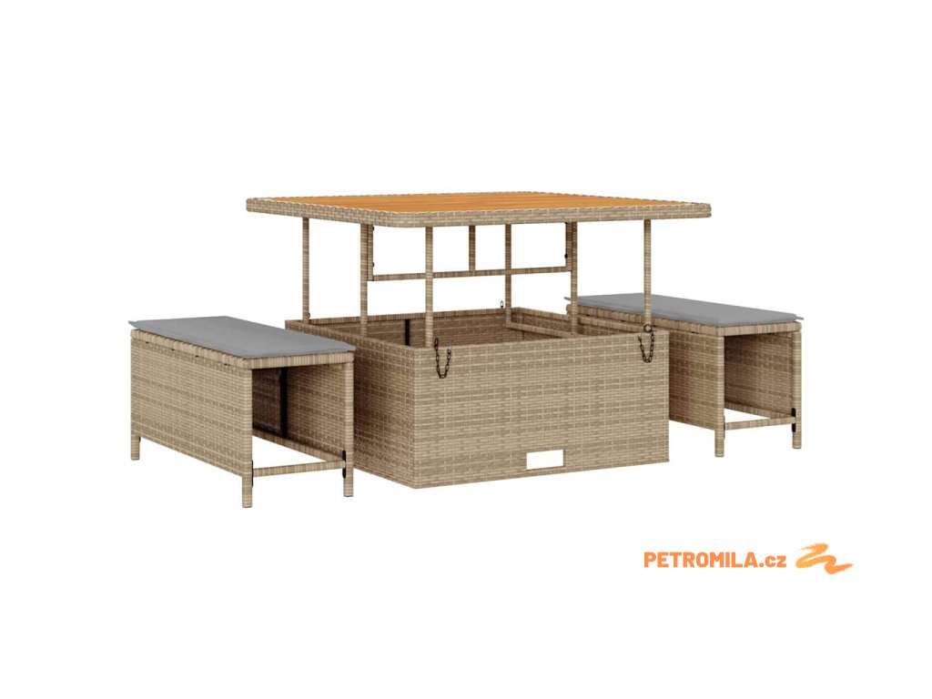 - Vyrobeno z polyratanu a akácie Tato zahradní souprava krásně vypadá díky polyratanu, známému svým luxusním vzhledem a odolností vůči venkovním podmínkám. Akáciové dřevo dodává přírodní punc a zvyšuje vizuální atraktivitu tvé zahrady s přírodními tóny. Tyto materiály zajišťují, že nábytek zůstává stále lákavý a odolný, takže hostům poskytne příjemné prostředí.