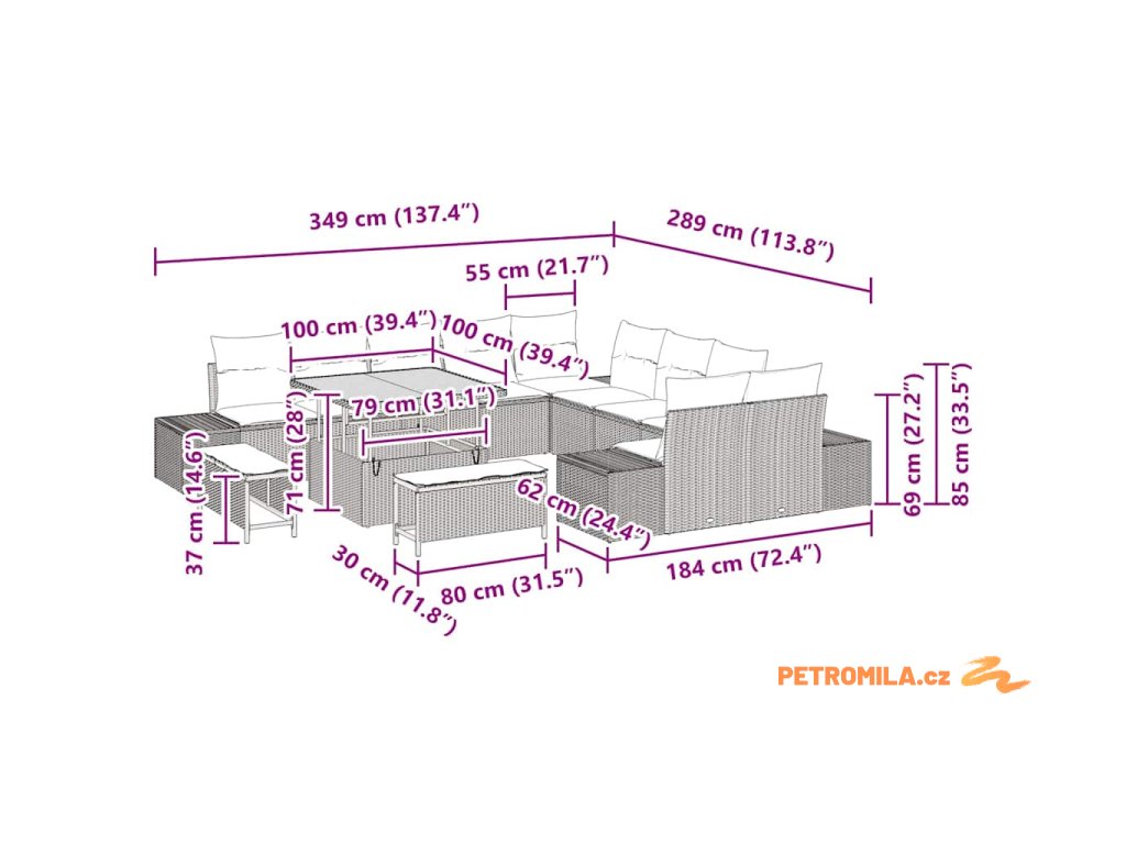 - 2 x Boční sofa, 2 x Rohové sedadlo, 6 x Centrální sedadlo, 2 x Dlouhý stolička, 1 x Stůl