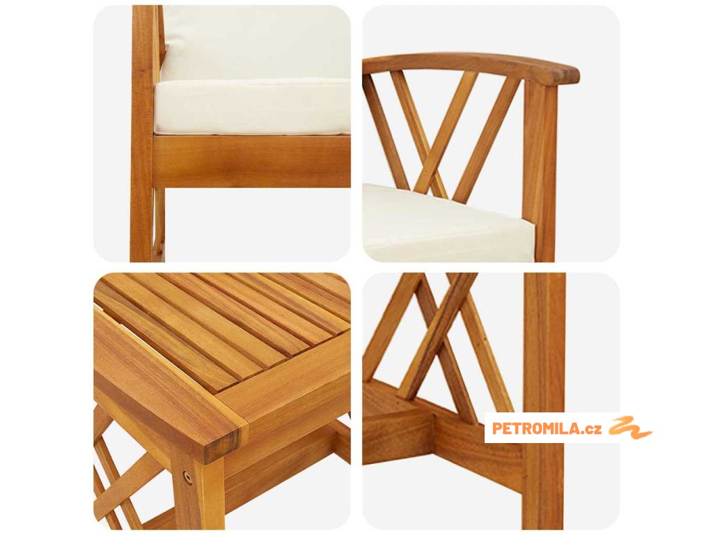 - Odolná kompozice: Tento set je z masivního akáciového dřeva, které je vyhlášené svou odolností venku. Tento materiál je odolný vůči vlhkosti i opotřebení, takže vydrží a je potřeba minimální údržba. Ošetření olejem podtrhuje jeho krásu a dává zahradě charakter a teplo.