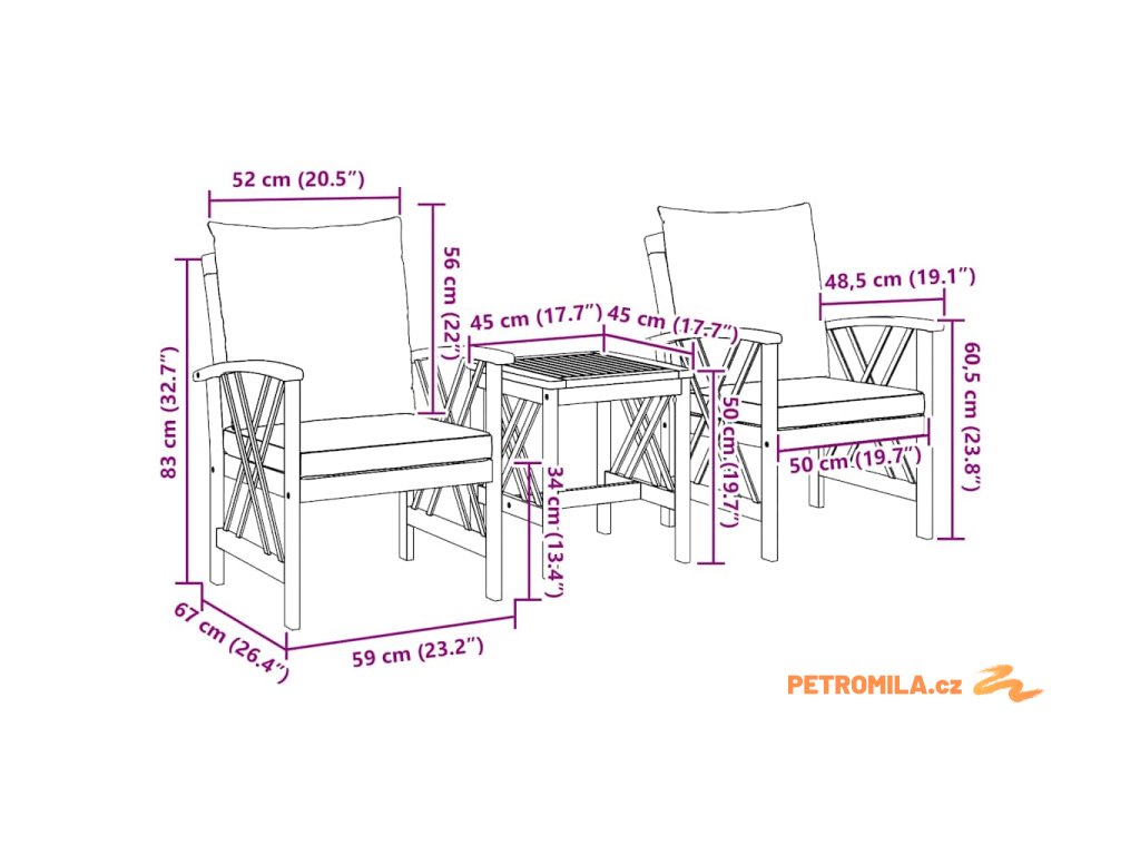 - Pohodlné rozměry: Každé křeslo má velikost 59 x 67 x 83 cm a stůl je kompaktní 45 x 45 x 50 cm, což znamená, že se tento set vejde do různých prostorů, aniž by je přetěžoval.