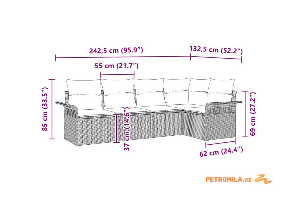 - Celkové rozměry: 242,5 x 132,5 x 85 cm (D x Š x V)
