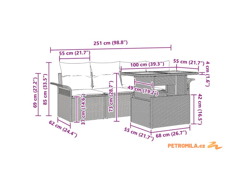 Tento modulární zahradní nábytek je perfektní do zahrad a na terasy, má moderní styl díky svým elegantním liniím a chytrému designu. Textura tkaniny a jeho vzhled dělají z něj univerzální volbu pro každého, kdo chce obohatit svůj venkovní prostor. Užijte si skvělý komfort a dobrý look s jeho stylovými a praktickými funkcemi. Ať už pořádáte party nebo si jen tak ležíte, tento set vám poskytne elegantní a jednoduchý způsob, jak si zlepšit venkovní život.