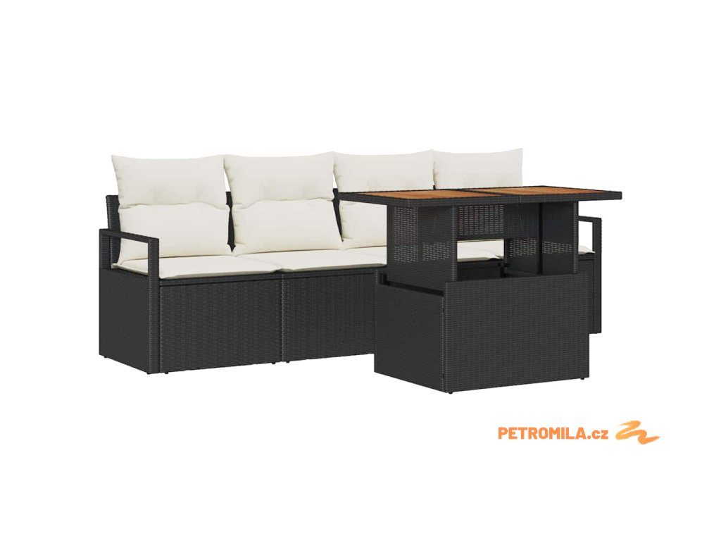 - Funkční prvky: Souprava obsahuje dvě pohovky s opěrkami a dvě středová místa se zabudovaným úložným prostorem pro vaše venkovní věci. K tomu pevný zahradní stůl z akáciového dřeva, ideální na jídlo nebo neformální setkání. Všechno je navržené tak, abyste měli uspořádaný venkovní prostor.
