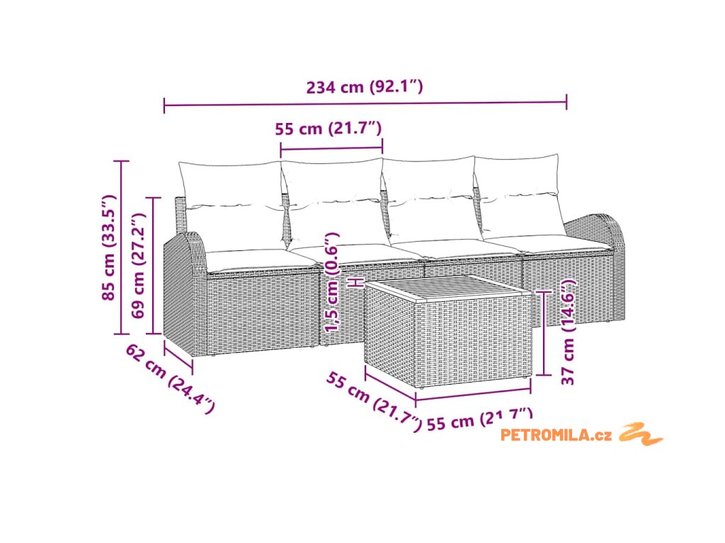 - 2 x střední sedák: 55 x 62 x 85 cm (DxŠxV)