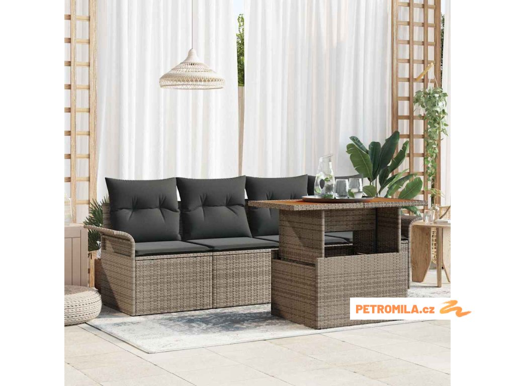- Materiály: Tento zahradní nábytek je vyrobený z kvalitního polyratanu, práškově lakované oceli a masivního akáciového dřeva. Každý materiál byl vybrán pro svoji pevnost a vzhled. Polyratan drží moderní look, zatímco ocelový rám dodává stabilitu. Akáciové dřevo přináší přirozený pocit a dělá set odolný vůči jakýmukoli počasí.