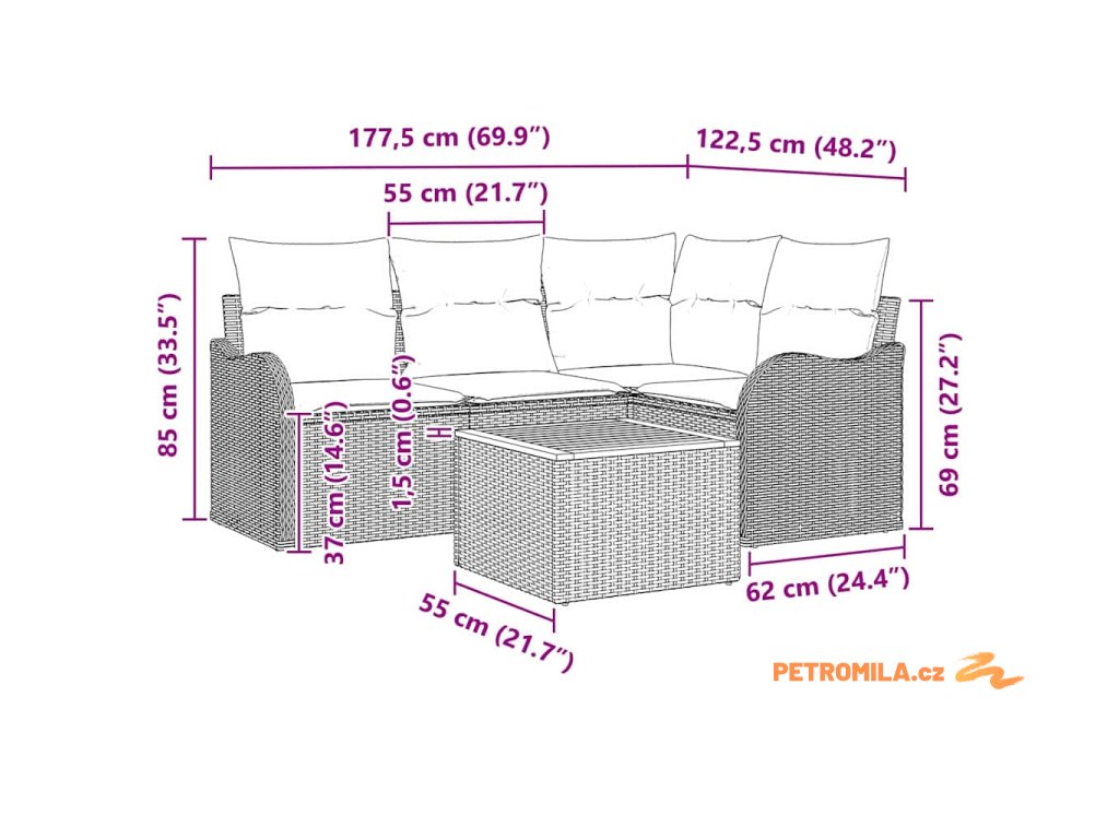 - 1 x rohové sedadlo: 62 x 62 x 85 cm (D x Š x V)