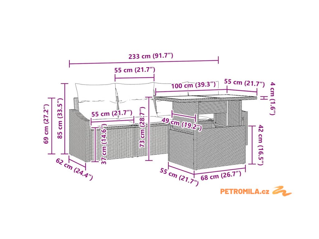 - Všechny součásti: Sada obsahuje dvě centrální sedačky a dvě arm pohovky s polštáři, které zajišťují pohodlí. Stůl poskytuje prostor pro jídlo nebo neformální povídání.