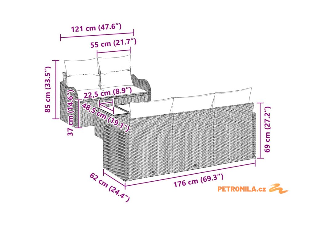 - Funkce /Design: Tento modulární set je navržen tak, abyste mohli lehce měnit jeho uspořádání podle velikosti prostoru nebo vašeho stylu. Úložný prostor uvnitř dodává ještě víc funkcí, ideální pro uschování polštářů nebo jiných potřebností. Jeho UV-odolné materiály zajišťují, že si dlouho udrží svůj vzhled.
