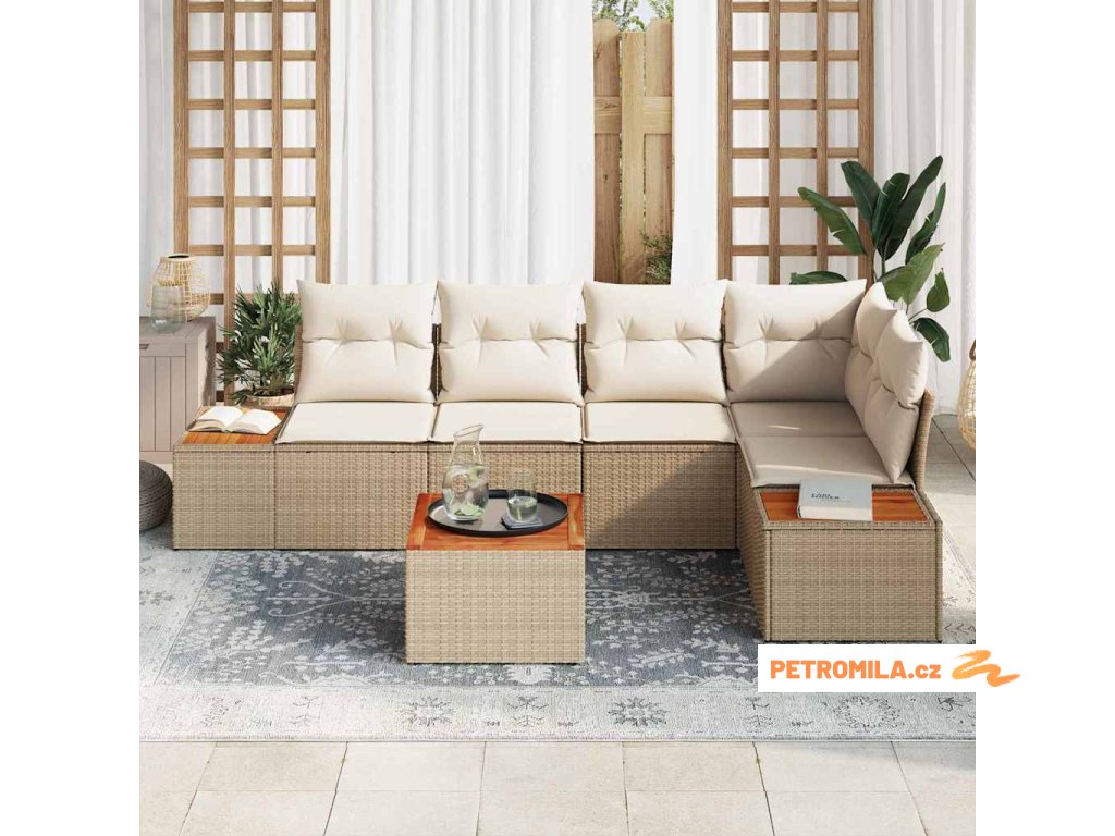 7dílný zahradní jídelní set s poduškami béžový polyratan