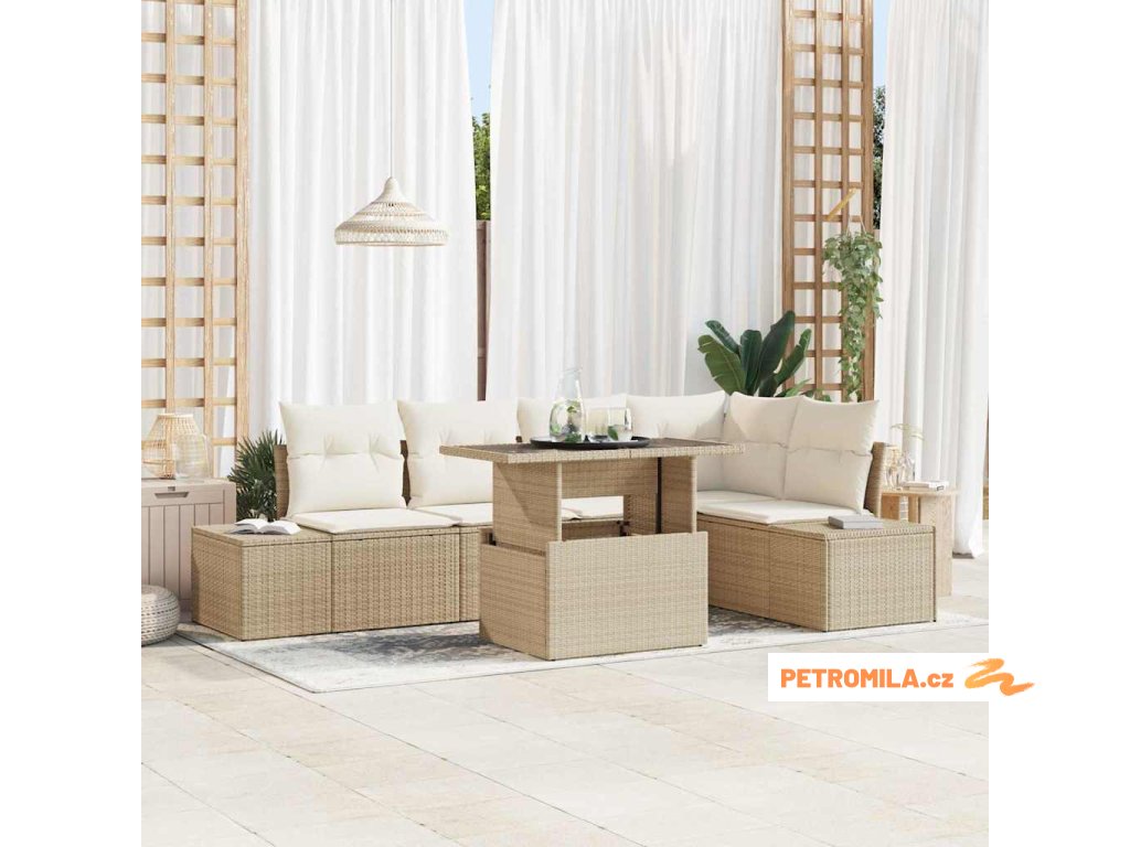 Sada zahradních pohovek s polštářem 6 pcs Béžová Poly Ratan