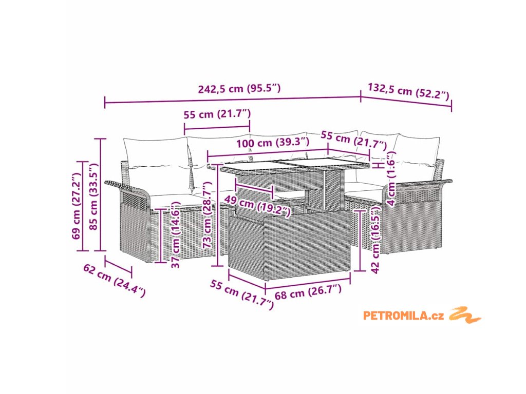 - 1 x rohové sedadlo: 62 x 62 x 69 cm (ŠxHxV)
