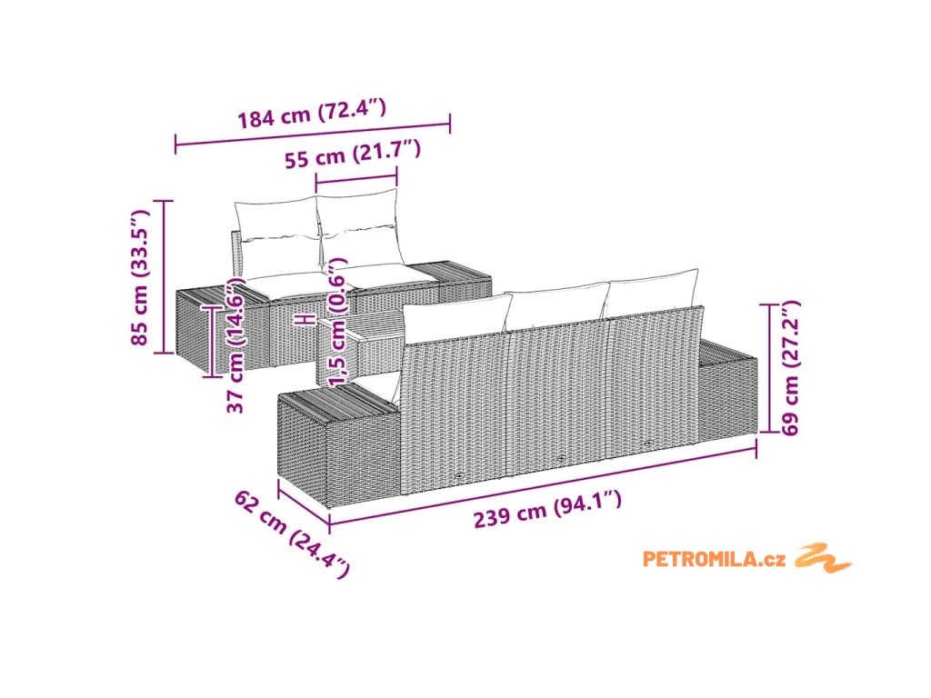 - 4 x boční pohovka: 37 x 62 x 37 cm (ŠxHxV)