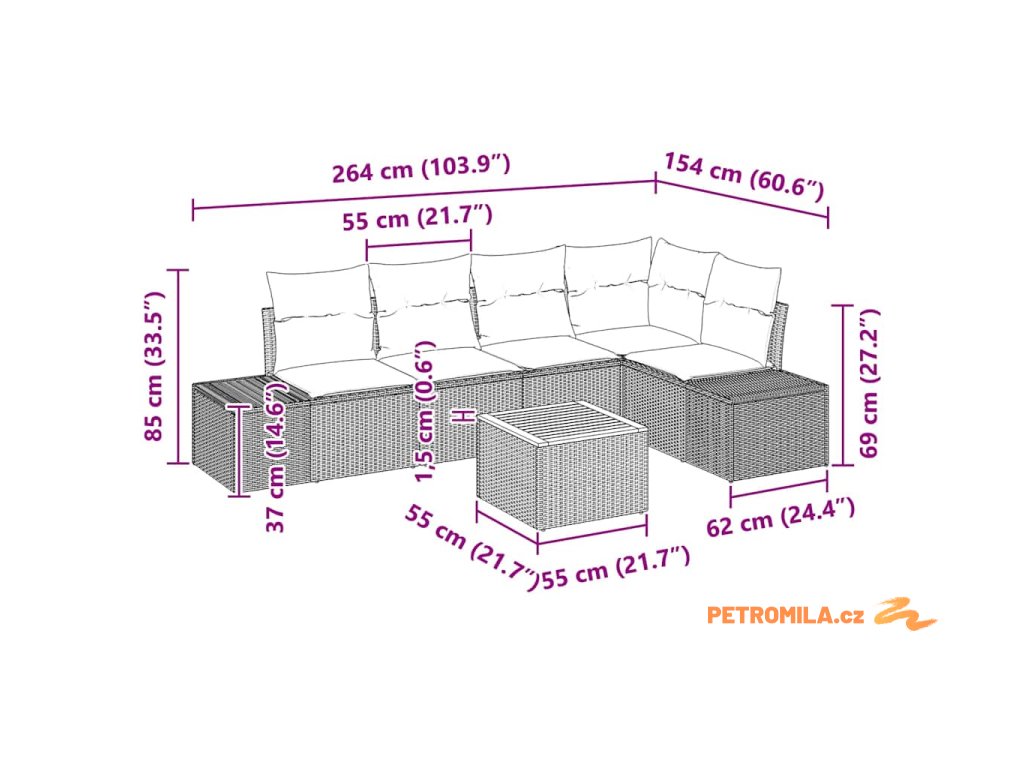 - 1 x rohové sedadlo: 62 x 62 x 85 cm (D x Š x V)