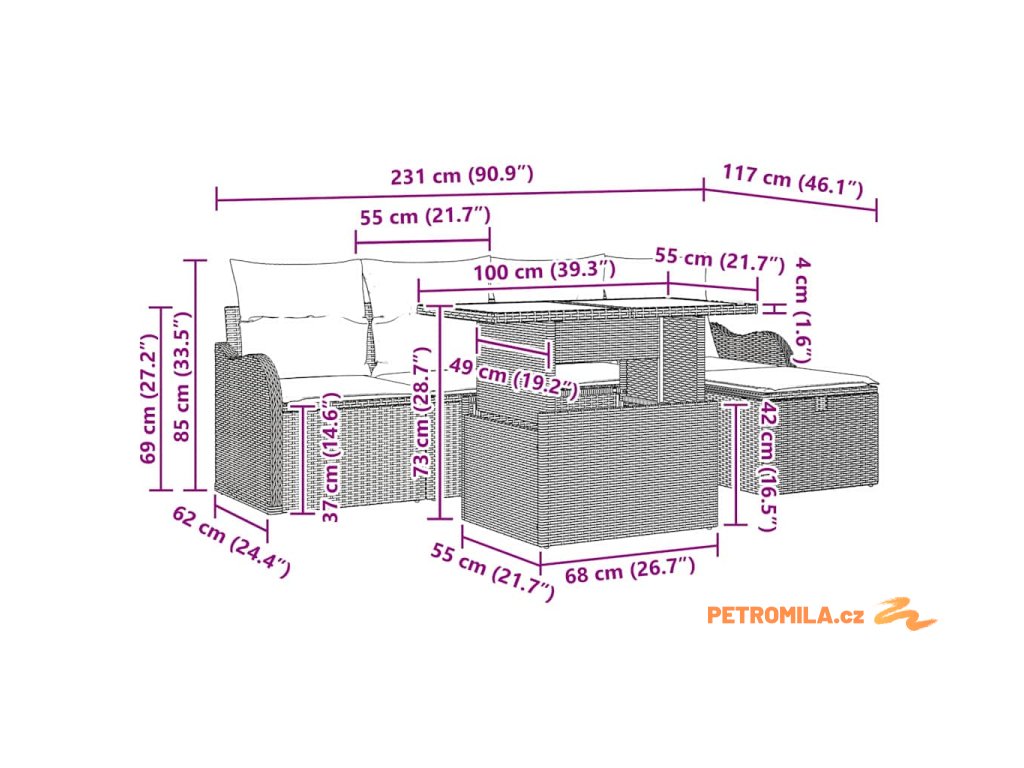 - 5 x sedací polštář: 55 x 55 cm (D x Š)
