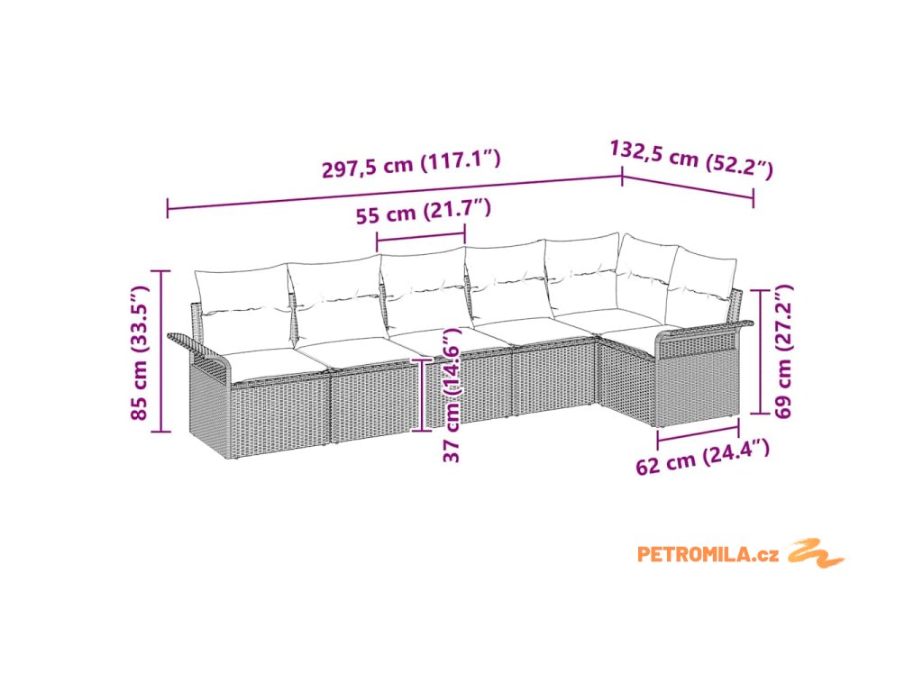 - 7 x zádový polštář: 55 x 55 cm (D x Š)