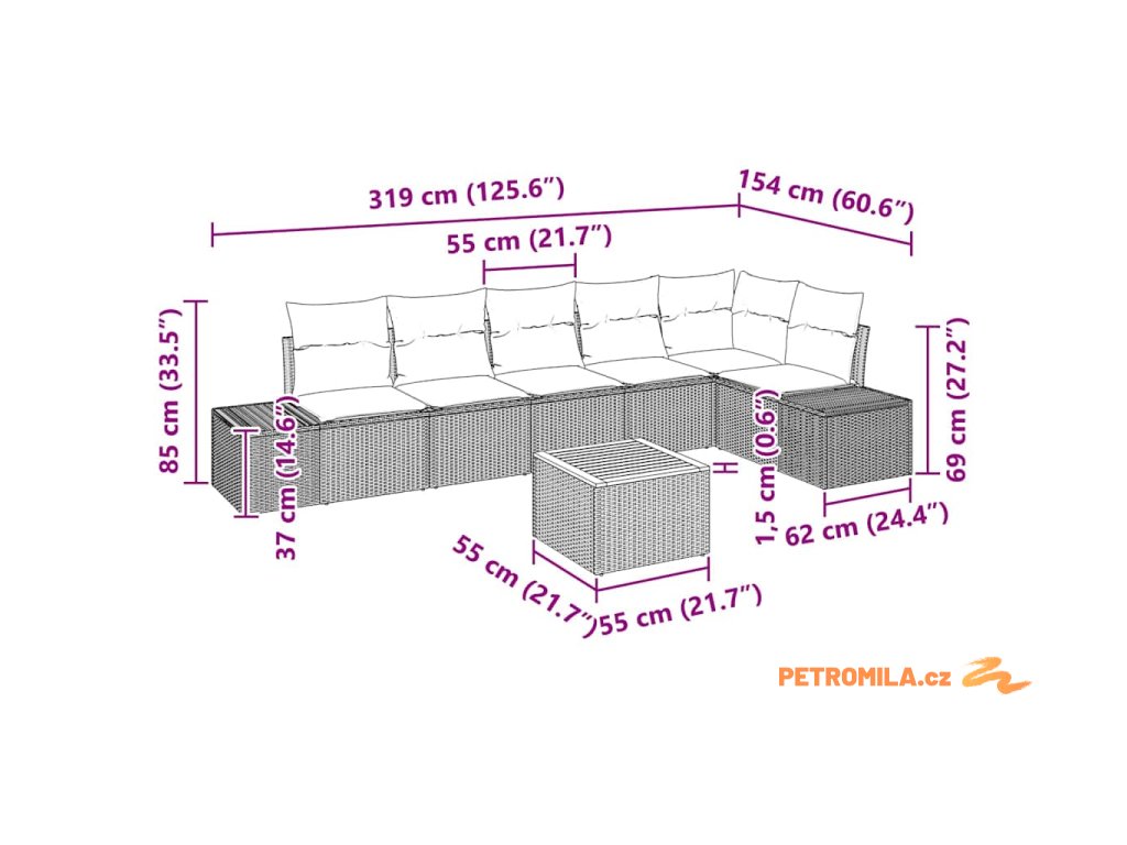 - 2 x Boční pohovka: 37 x 62 x 37 cm (D x Š x V)