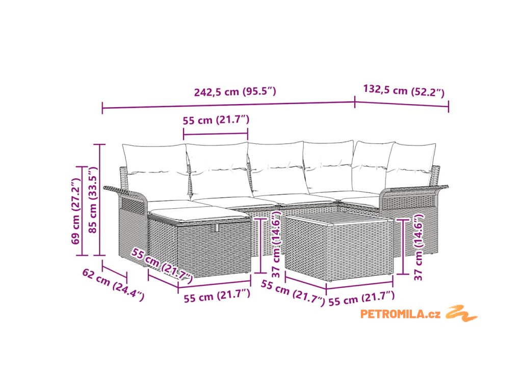 - 2 x Střední sedák: 55 x 62 x 85 cm (ŠxHxV)