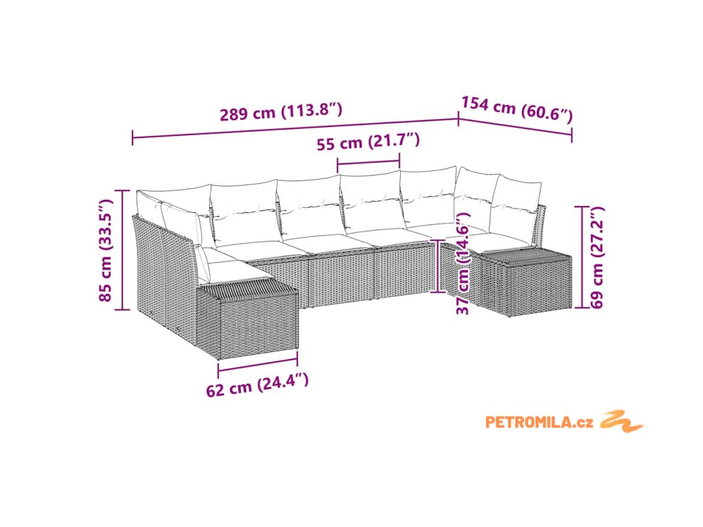 - 2 x Boční sofa: 55 x 55 x 37 cm (D x Š x V)