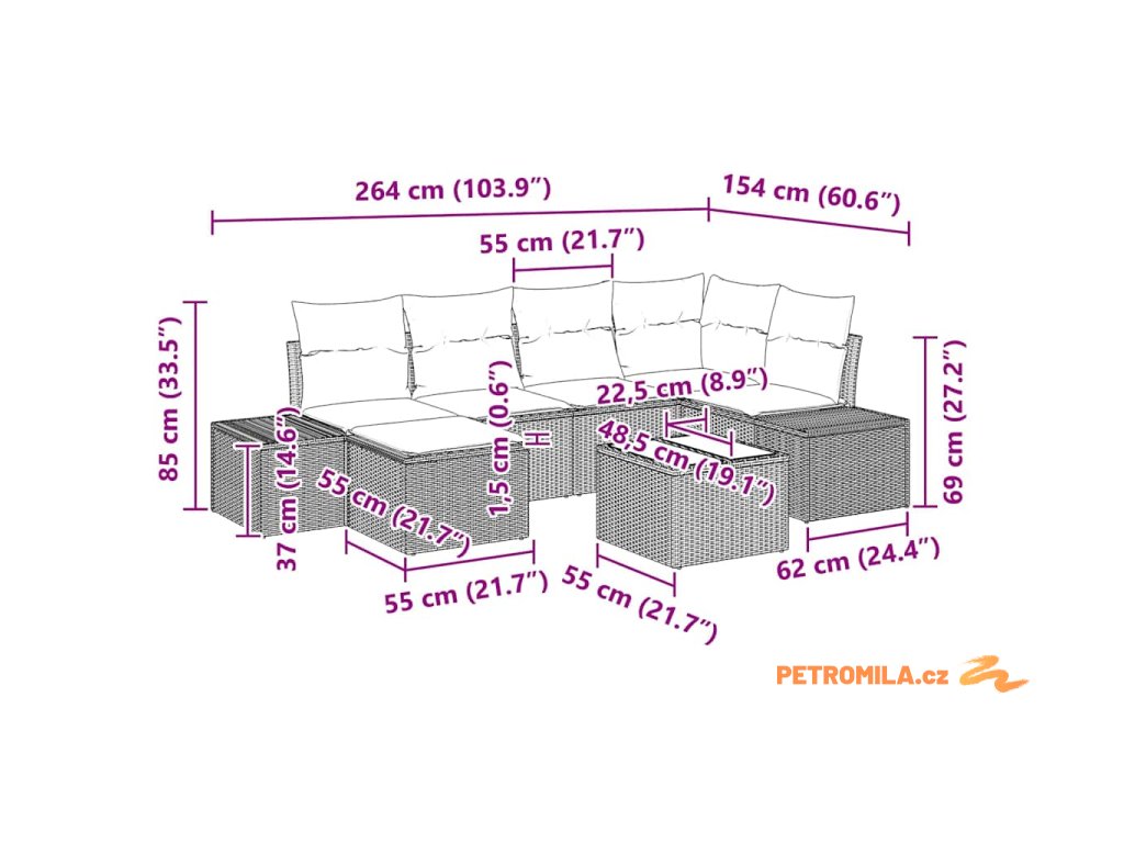 - 2 x Boční sedačka: 55 x 55 x 37 cm (ŠxHxV)