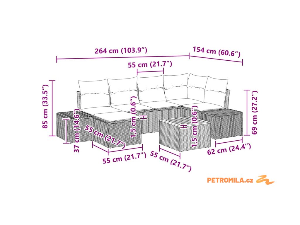 - 4 x střední sedák: 55 x 62 x 85 cm (DxŠxV)