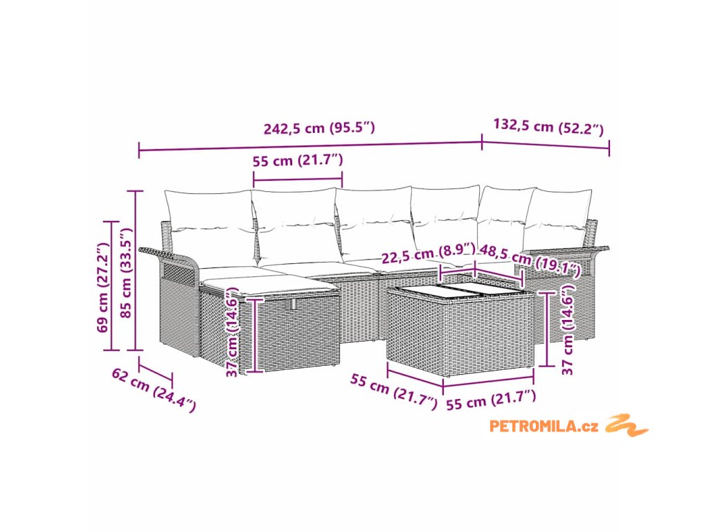 - Celkové rozměry: 242,5 x 132,5 x 85 cm (D x Š x V)