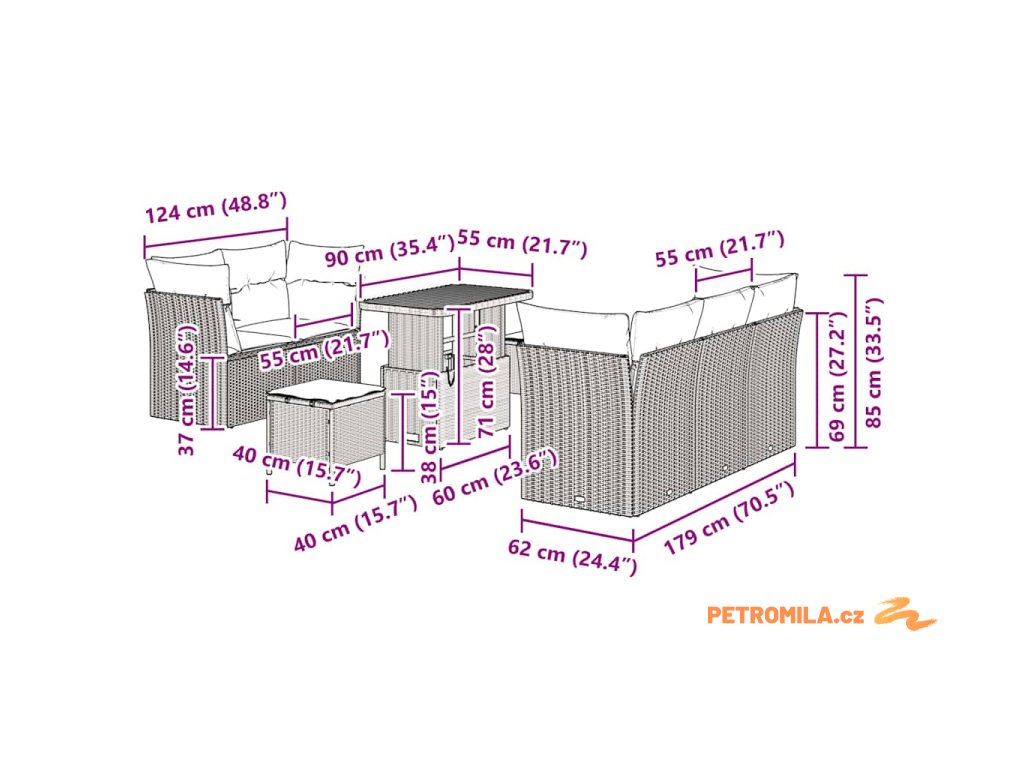 - 4 x Rohová sedačka: 62 x 62 x 85 cm (ŠxHxV)