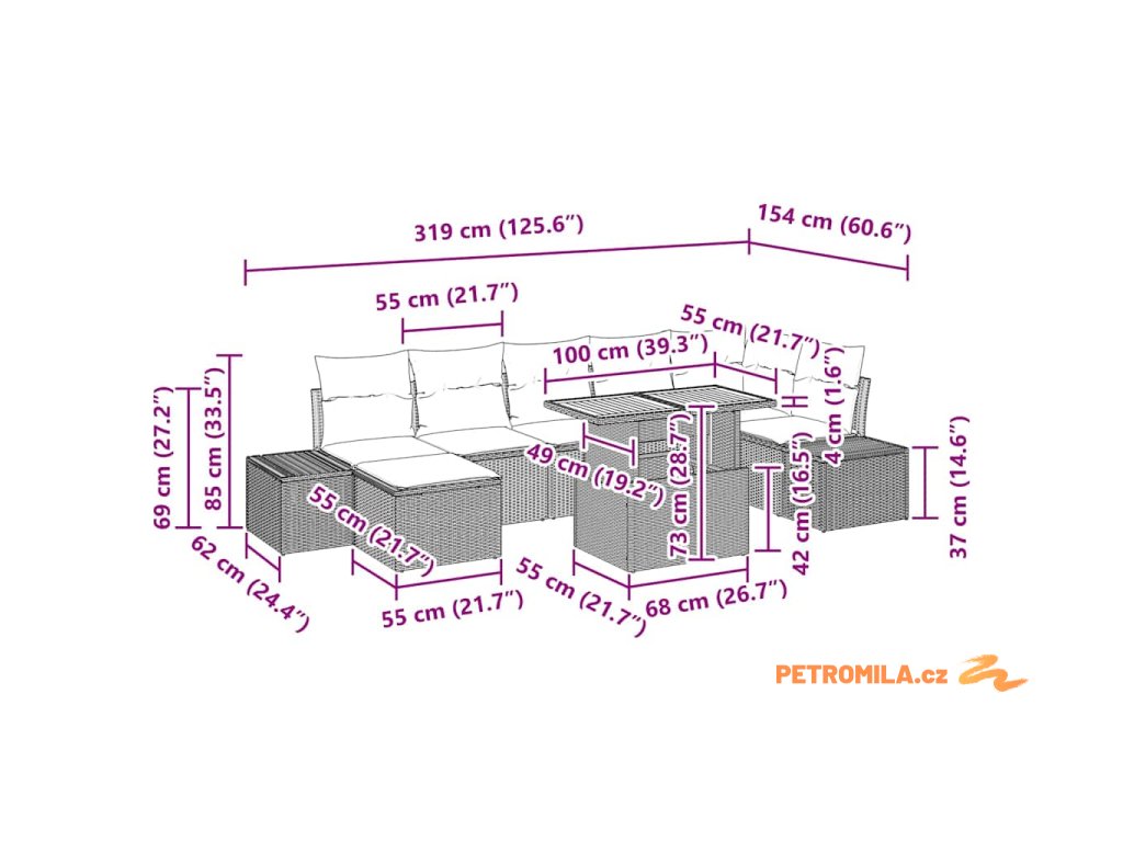 - Součásti: Obsahuje pohodlné polštáře s pěnovým výplní, pevné opěrky rukou a modulární uspořádání, které si můžeš přizpůsobit podle sebe. Dostaneš dva boční gauče, jednu rohovou sedačku, tři středové sedačky, podnožku a stůl se úložným prostorem pro všechny tvoje věci.