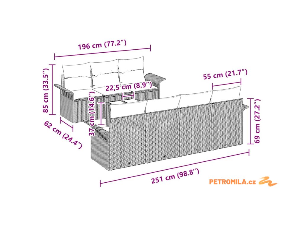 - 7 x zadní polštář: 55 x 55 cm (D x Š)