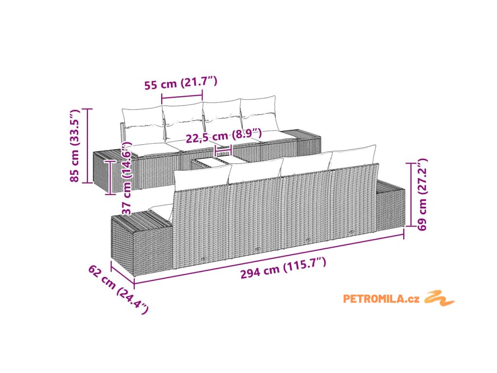 - 2 x boční sofa: 184×62×85 cm (Š×H×V)