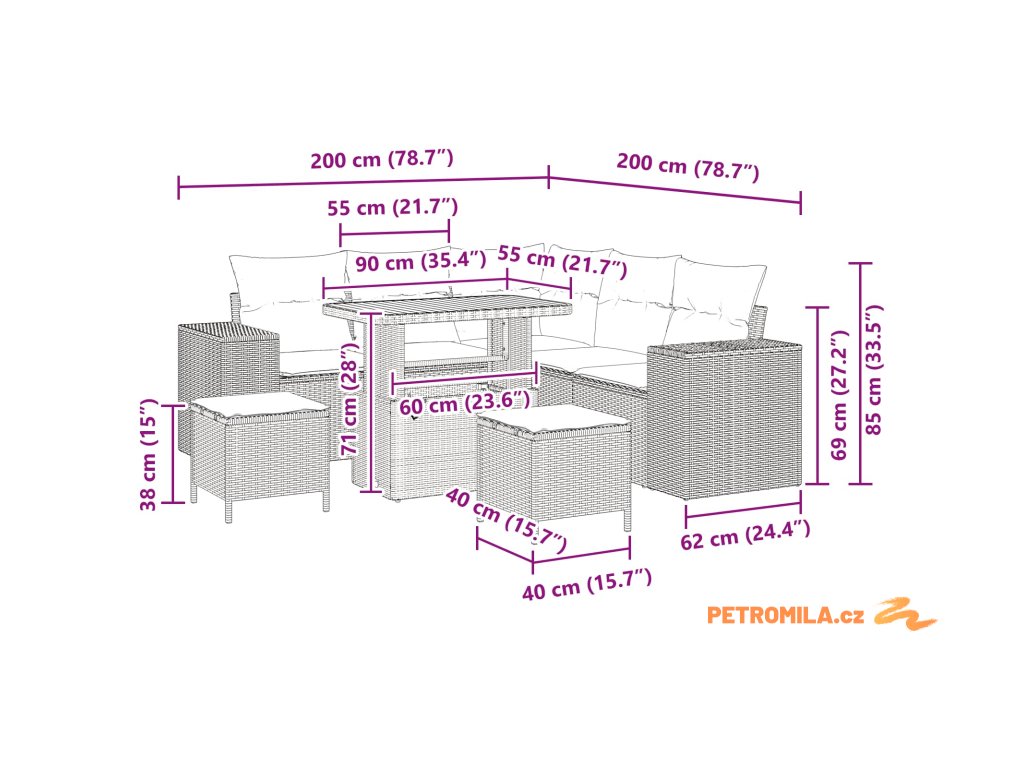 - 1 x Rohové sedadlo: 62 x 62 x 85 cm (ŠxHxV)