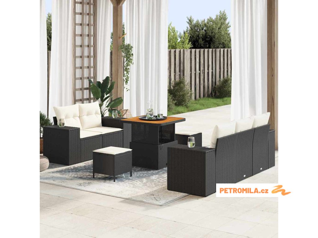 9dílný zahradní jídelní set s poduškami černý polyratan