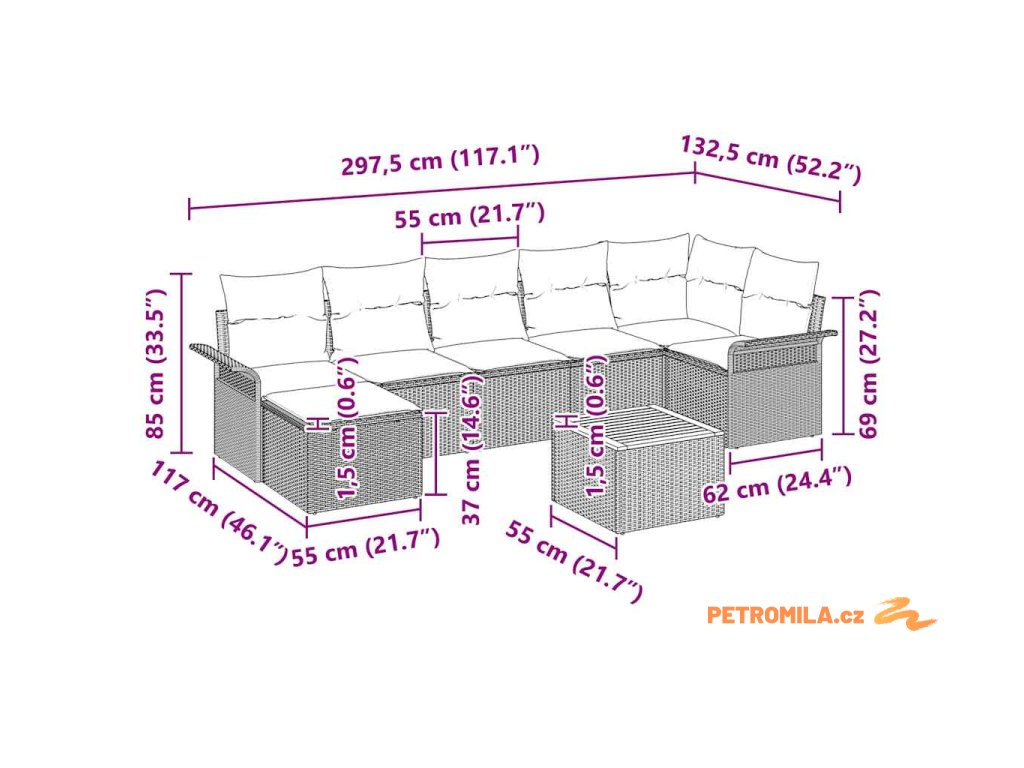 - 1 x rohové sezení: 62 x 62 x 85 cm (D x Š x V)