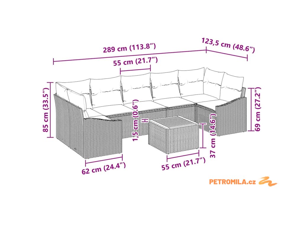 - 2 x rohové sedadlo: 62 x 62 x 85 cm (D x Š x V)