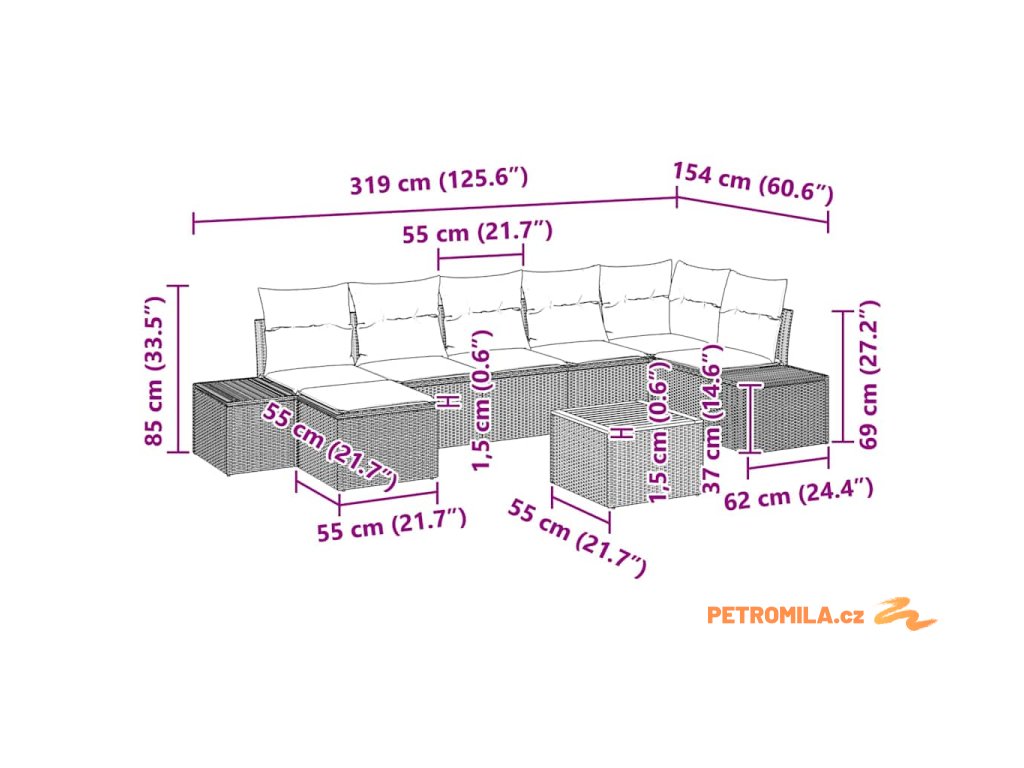 - 3 x střední sedák: 55 x 62 x 85 cm (DxŠxV)