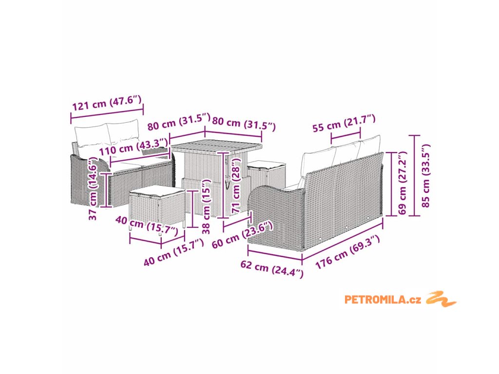 - 4 x Pohovka s opěrkami: 60.5 x 62 x 85 cm (ŠxHxV)