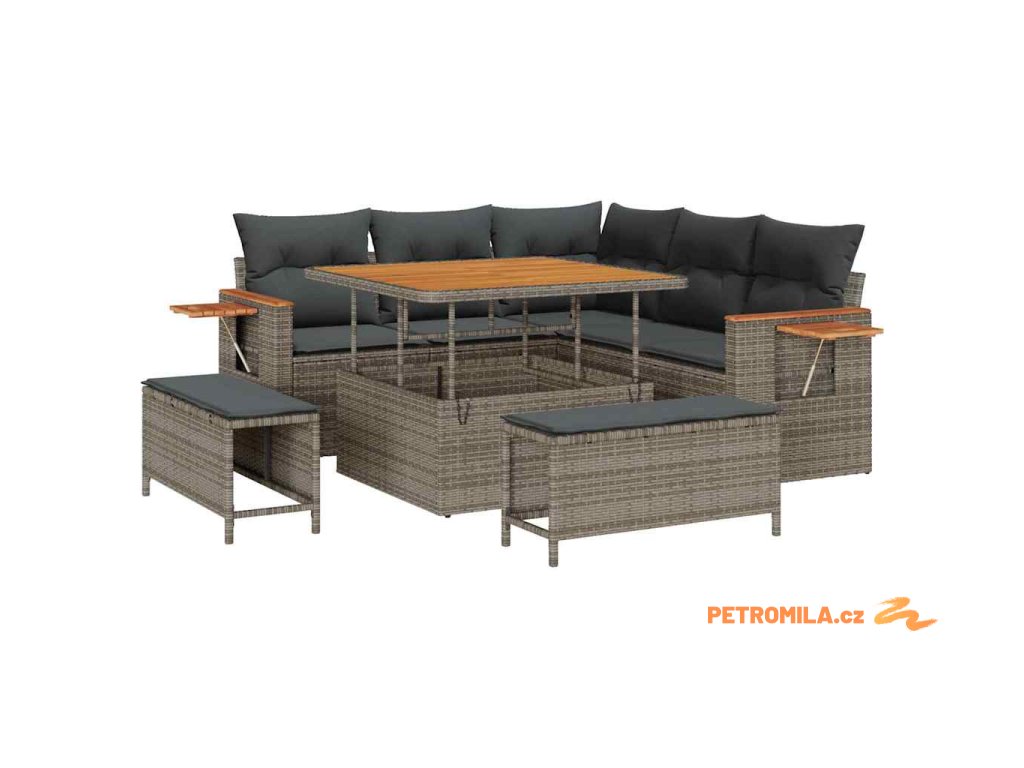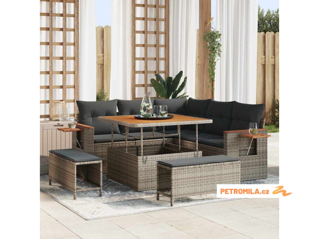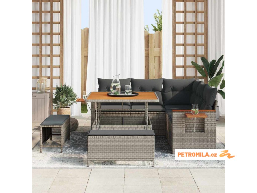- Materiály: Sada zahradního gauče je z odolného poly ratanu s pevným rámem z práškově lakované oceli. Kombinace těchto materiálů ji dává odolnost vůči slunci a dešti, takže je ideální pro slunečnou terasu nebo stinnou zahradu. Teplé akáciové dřevo přidává designu přírodní nádech.