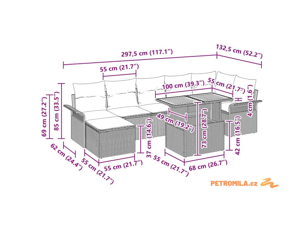 - Součásti: Sada obsahuje modulární díly, včetně dvou armovaných pohovek, rohového sedáku, tří středových sedadel, podnožky a zahradního stolu. Každé sedadlo má úložný prostor pod sebou, což zvyšuje praktičnost aniž by se ztratila elegance. Opěrky rukou jsou z polyratanu pro pohodlí a styl, skvělé pro lenošení.