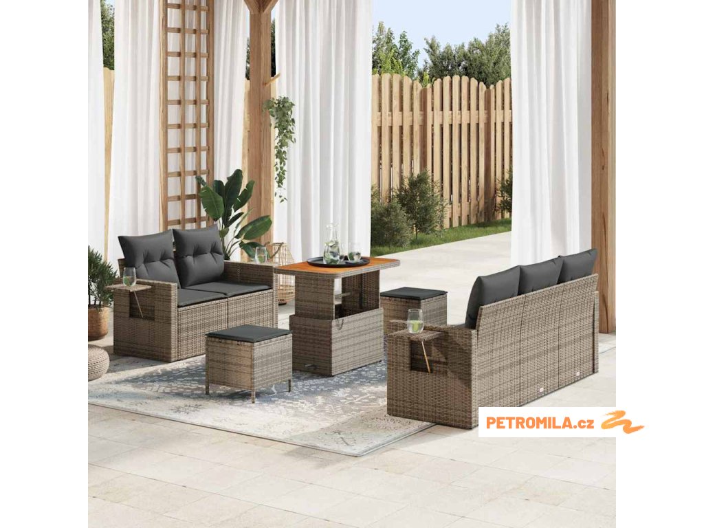 9dílný zahradní jídelní set s poduškami světle šedý polyratan