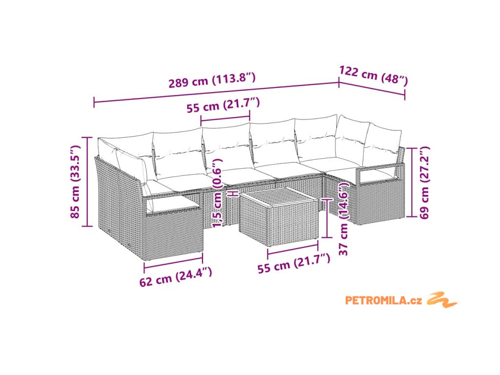- Součásti sady: Obsahuje tři středová sedadla, dva rohové kusy, dvě pohovky s područkami a stolek. Každý kus je navržen pro pohodlí a praktičnost, takže máte dostatek místa na sezení a hezké stolování.