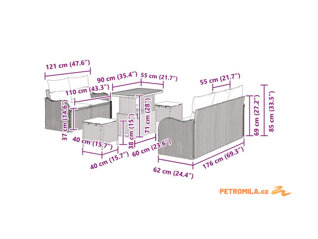 - 4 x Pohovka s opěrkami: 60.5 x 62 x 85 cm (ŠxHxV)
