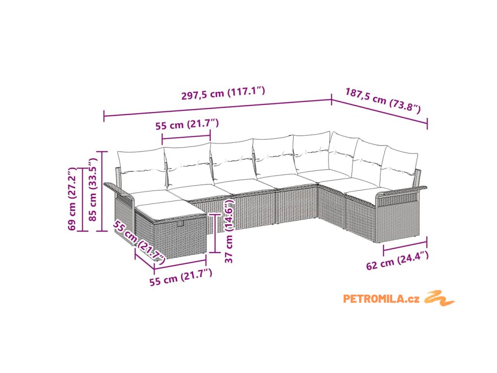 - Celkové rozměry: 297,5 x 187,5 x 85 cm (D x Š x V)