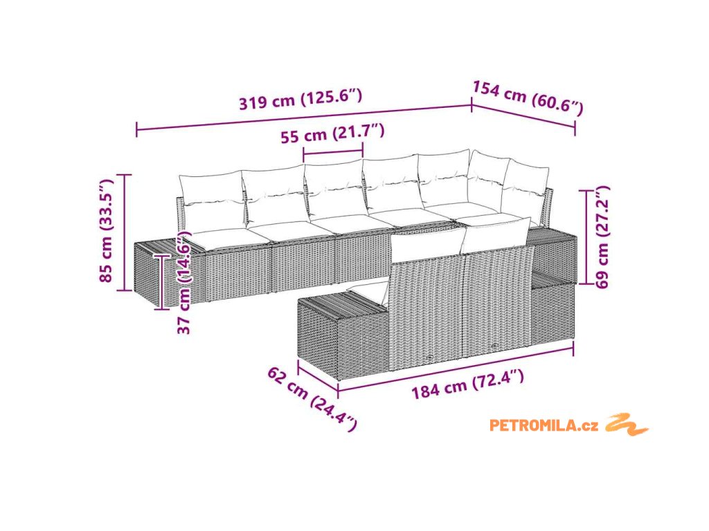 - 4 x Boční pohovka: 55 x 55 x 37 cm (D x Š x V)
