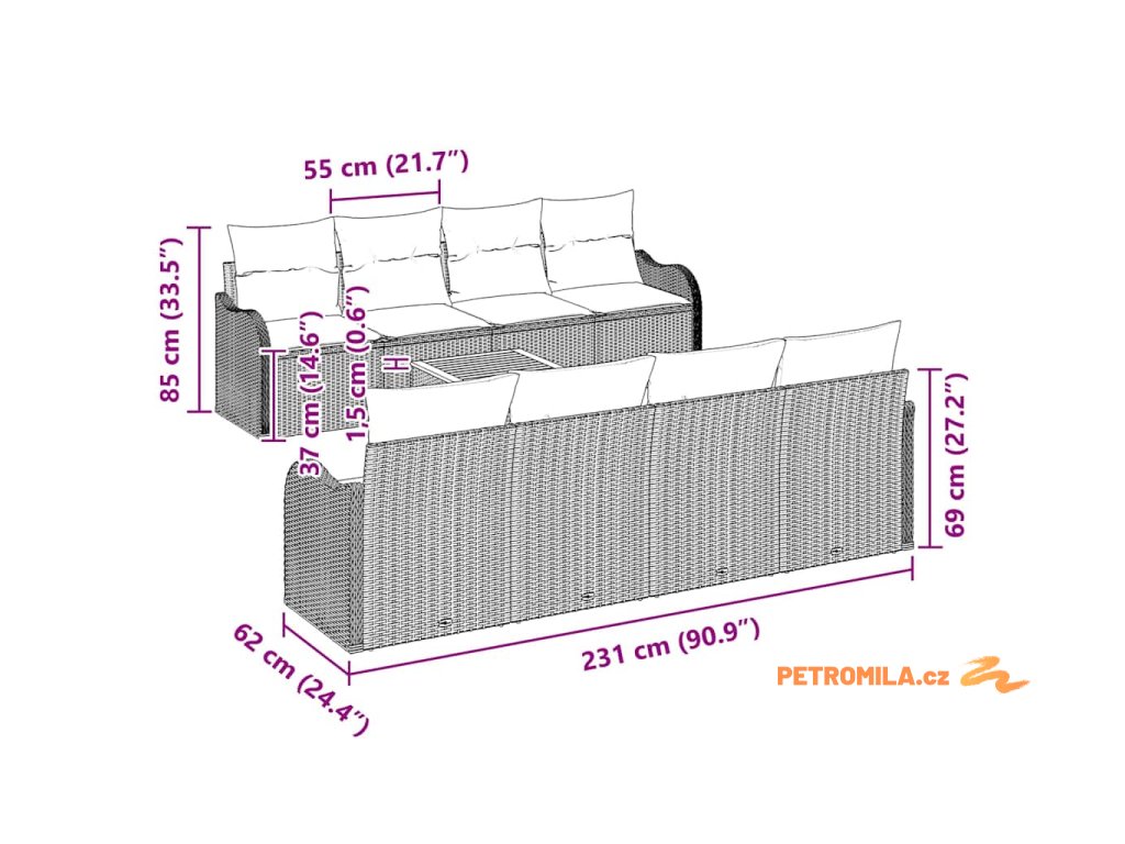 - 4 x Boční pohovka: 50,5 x 62 x 85 cm (DxŠxV)