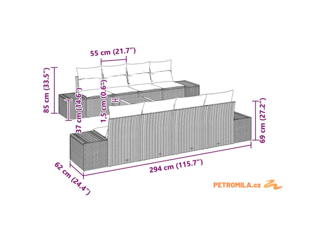 - Materiály: Polyratanové vlákna zajišťují odolnost a eleganci, pohovka zůstává chráněna před UV zářením a zachovává si svůj vzhled a kvalitu. Akáciové dřevo přidává přírodní prvek k modernímu designu, což zvýrazňuje variabilitu.