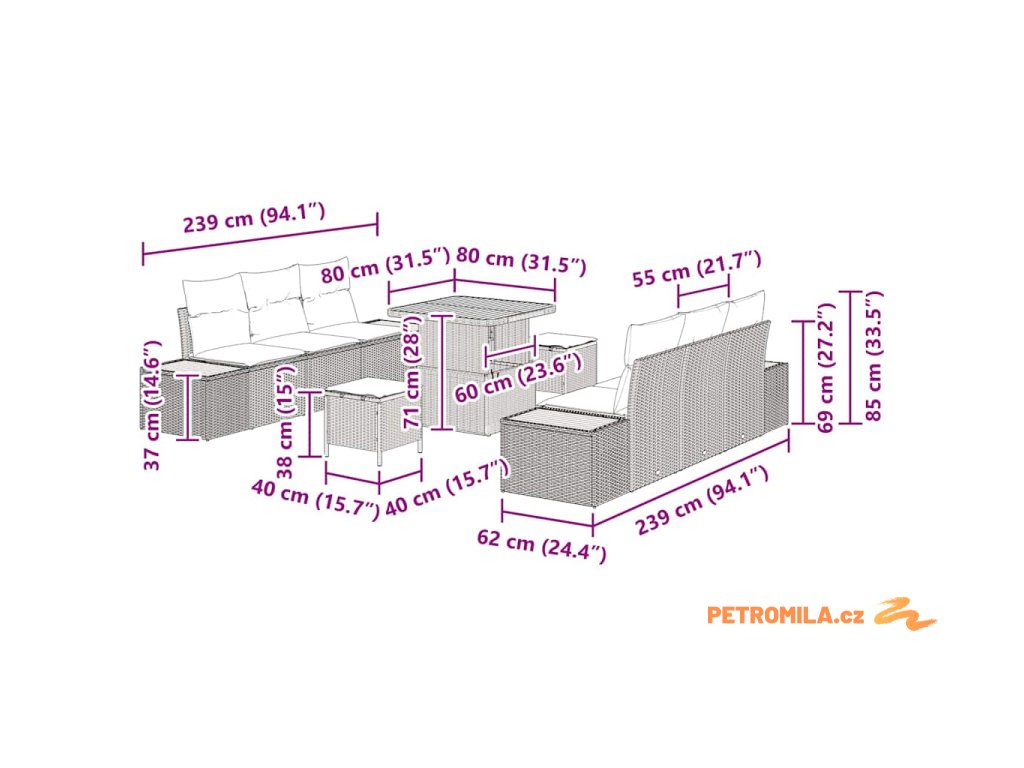- Materiály: Tato pohovková souprava je vyrobená z poly ratanu a polyesteru, navržená pro pohodlí a odolnost venku. Odolné materiály proti blednutí, skvrnám, UV záření a vodě zvládnou jakékoli počasí.