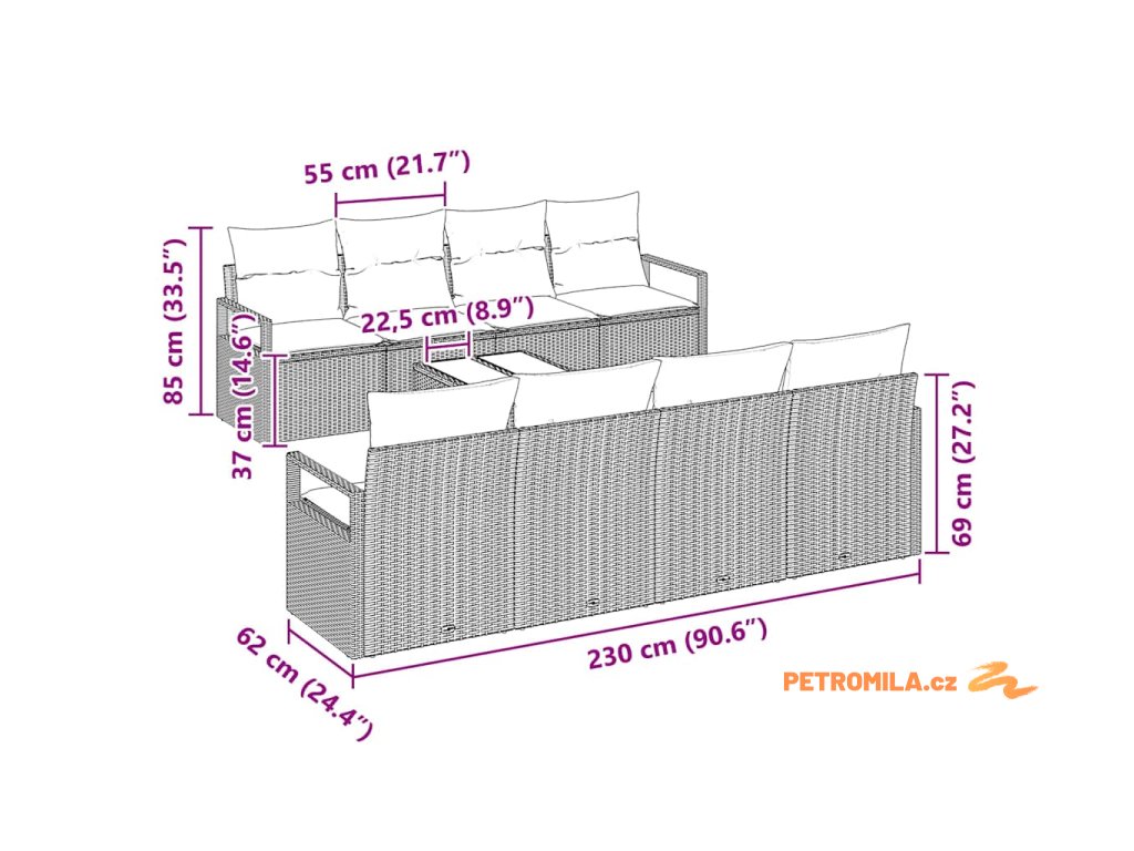 Tento modulární zahradní sofa set je elegantní a funkční volba pro venkovní odpočinek a zábavu. Jeho obdélníkový tvar se skvěle hodí nejen do zahrad, ale i na terasy. Hlavními prvky jsou různé sedací možnosti a středový stůl, přičemž každý díl je navržen tak, aby vytvořil pohodlnou a příjemnou atmosféru. Set má moderní design, minimalismus a funkčnost, což ho dělá flexibilním pro různé uspořádání a osobní styl.