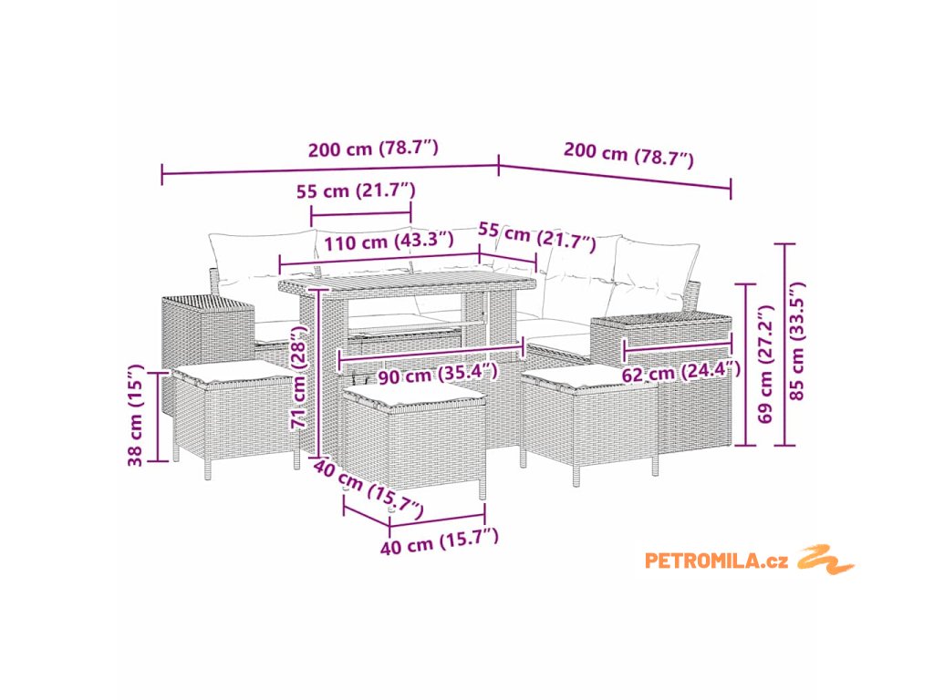 - 1 x Rohové sedadlo: 62 x 62 x 85 cm (ŠxHxV)