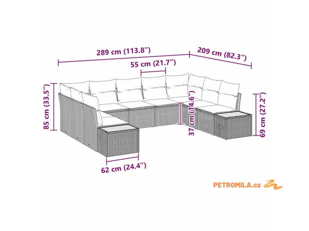 - 2 x Boční pohovka: 184 x 62 x 69 cm (D x Š x V)