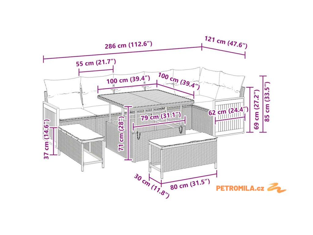 - Celkové rozměry: 100 x 100 x 71 cm (D x Š x V)